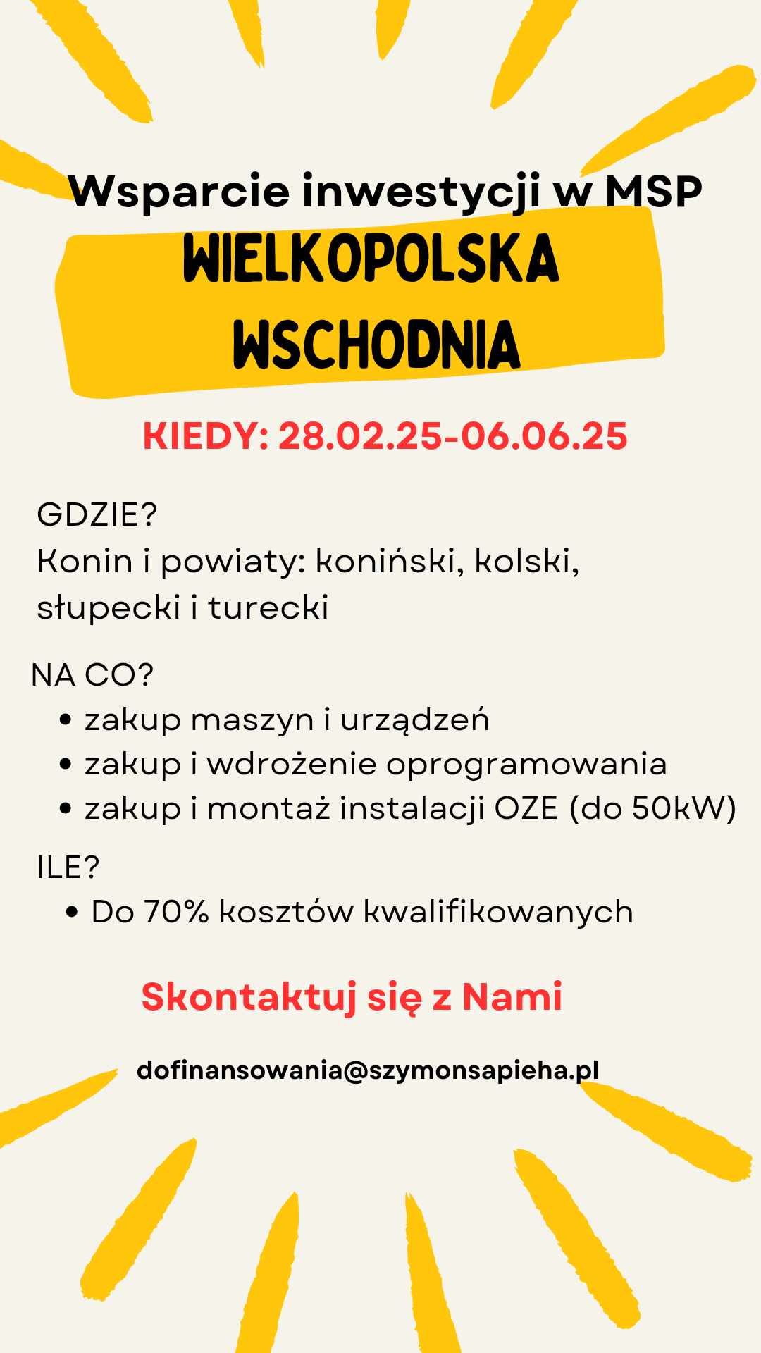 Środki przeznaczone zostaną na rozwój Wielkopolski Wschodniej tj. m. Konin oraz powiatów: konińskiego, słupeckiego, tureckiego, kolskiego.
